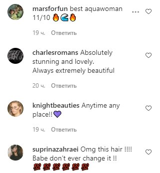 «Без сомнения! ❤️❤️; Абсолютно. Также. Цвет волос на этом парике – создан для вас 👏👏; Это парик?; Конечно да; Банда поклонников всегда здесь для тебя 😊❤️; Счастливый день!! Удачного дня, королева ❤️❤️; Конечно, детка, я определенно пойду с тобой в мокрое приключение 🥰; Куда угодно; Русалка 😍; Куда бы вы ни пошли шикарно 🔥королева играется🔥🔥😍; лучший аквалангист 11/10 🔥🌊🔥; Совершенно потрясающе и мило; Ой, эти волосы !!!! Детка, никогда этого не меняй».