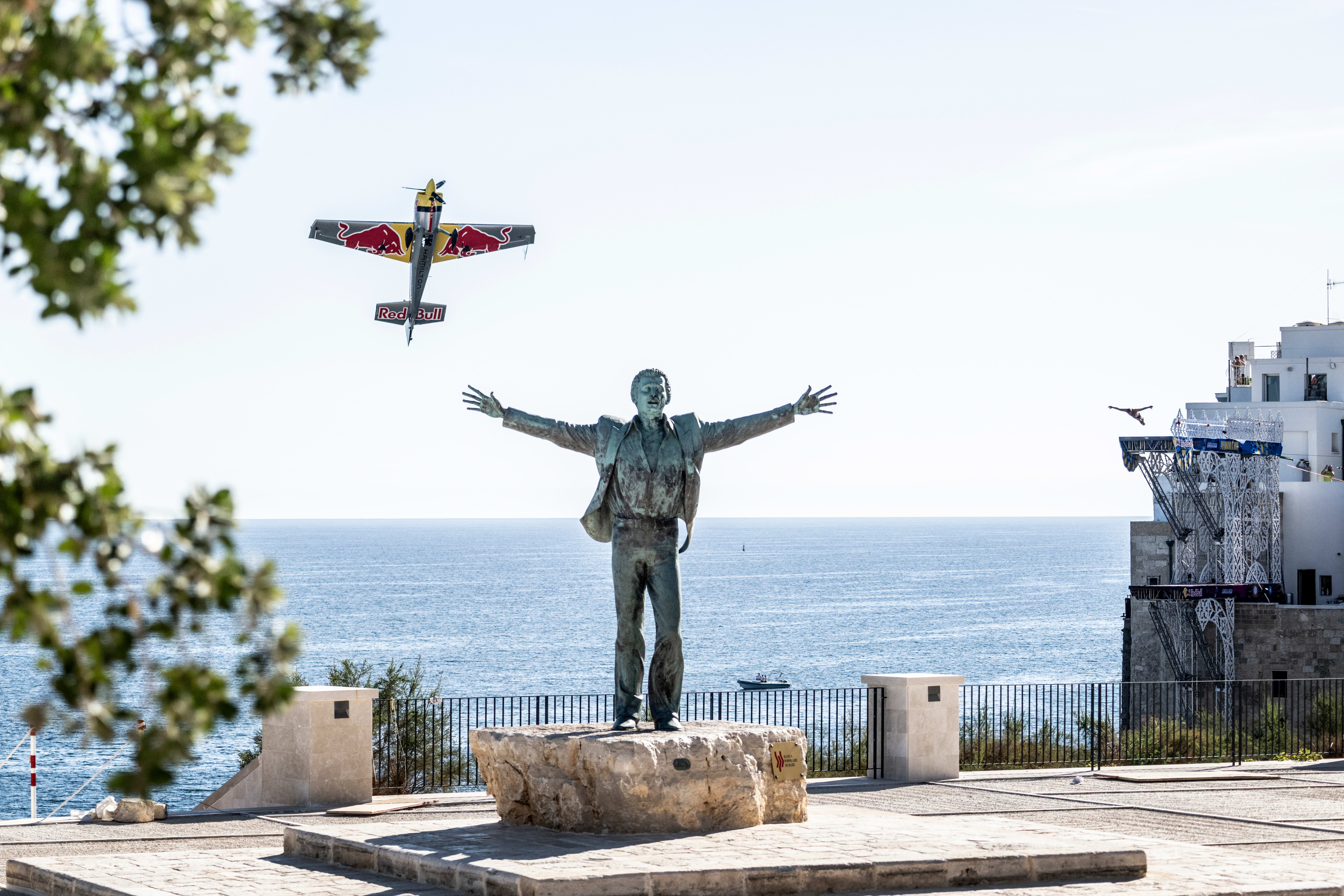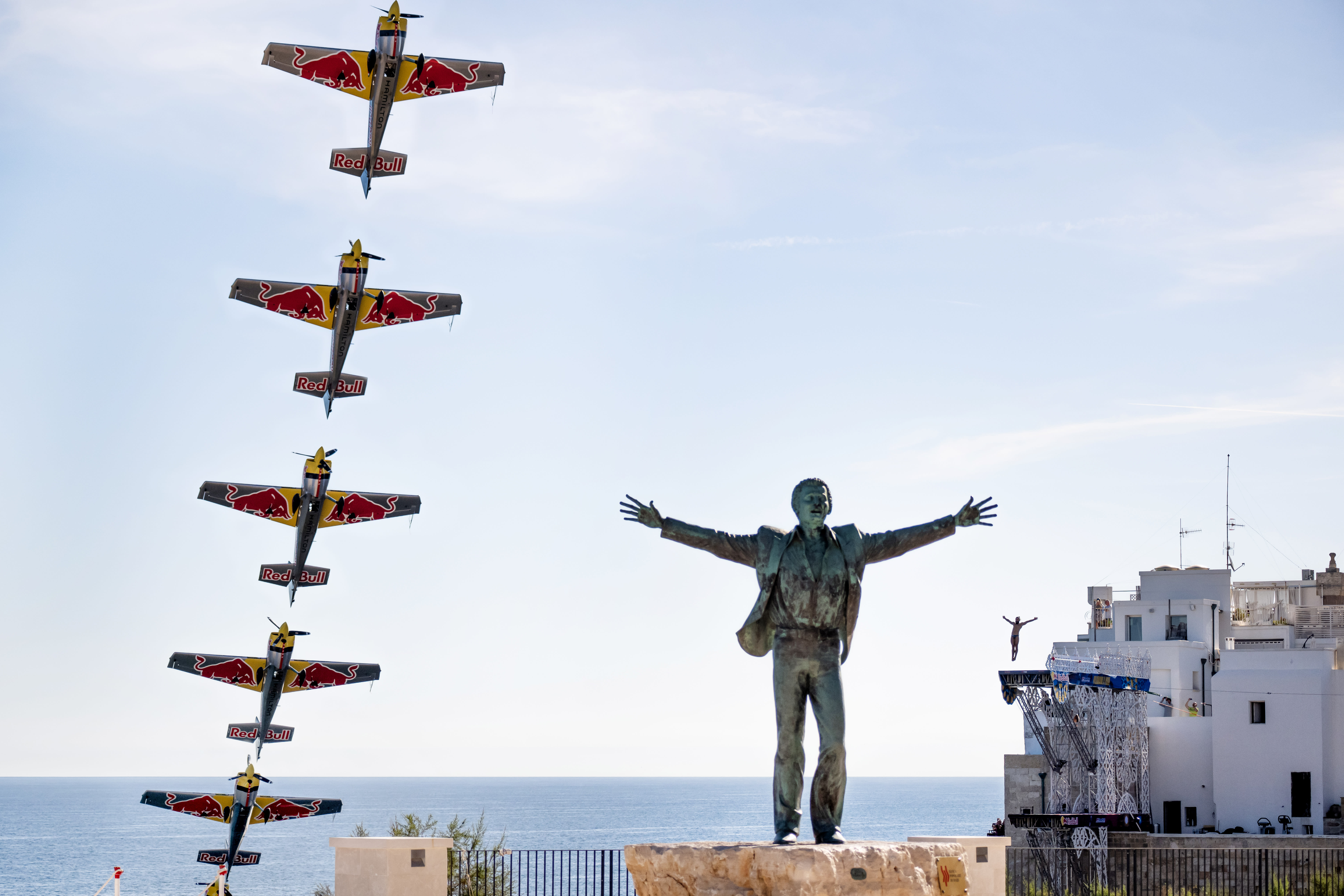 Рано утром в прекрасном адриатическом городке зрителей ожидало множество гравитационных подвигов людей, поражающих воображение своим мастерством, смелостью и точностью: клифф-дайверы мирового класса Алессандро Де Роуз, Эйдан Хеслоп, Каталин Преда и Артем Сильченко совершили свои акробатические погружения в море в координации с показательными выступлениями итальянского пилота-каскадера.