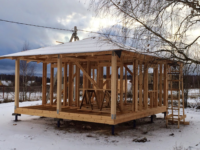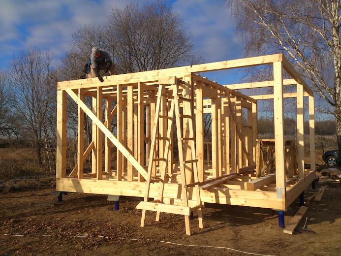 параллельно, вечерами штудировал СНИПы и ГОСТы, терзал автокад, курил форумы, так как в силу нескольких факторов (небольшой бюджет, недоверие ко всяким "строителям", ну и просто из созидательного удовольствия) решил строить сам. Поначалу хотел возвести просто бытовку своими руками, но в итоге еще на стадии проекта бытовка превратилась в маленький, но вполне симпатичный каркасный домик, с небольшой прихожей, санузлом и жилой комнаткой-кухней.