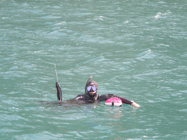 Только залезли в воду, порадовались прозраку, на семи метрах дно отчетливо просматривалось, но буквально через 20-30 минут пошла текуха и видимость ухудшилась. Взял полосатого окуня и попугайчика, та как попугая просил кэп, домой, на том ям. Нашли не плохой участок, рыба встречалась, но текуха такая что не выгребеш :( видел там пару здоровых рыбин, но на выстрел не подпустили, одна судя по словесстному описанию оказалась какой то разновидностью попугаев. Нырять на этом участке просто не реально, 1-2 нырка, и потом 10-15 минут вдоль самого бережка на верх. Да и видимость уже упала, делать там стало особо нечего, сплавлялись пару раз ниже, но там уже нет текухи и нет рыбы, хоть и места замечательные. Сегодня я для себя твердо уяснил. сопоставив все предыдущие охоты, рыба тут не стоит на стоячей воде или где есть обратка и воду крутит, по карайней мере нормальной рыбы в таких местах я не видел. нужна хоть не большая но текуха. Когда мне надоело бороться с течением в мутняке я решил уйти дальше, на самый конец острова, на мыс. Для этого надо было преодолеть пляж, ластал и ластал, ластал и ластал… на дне голое дно, рыбы понятно нет, но и на берег выходить нельзя, остров принадлежит военным, если что, сразу пальнут. Дима рассказывал, был в девяностых случай, завалили двух дайверов вышедших на берег, но вроде не на этом острове, но все равно проверять не хотелось.