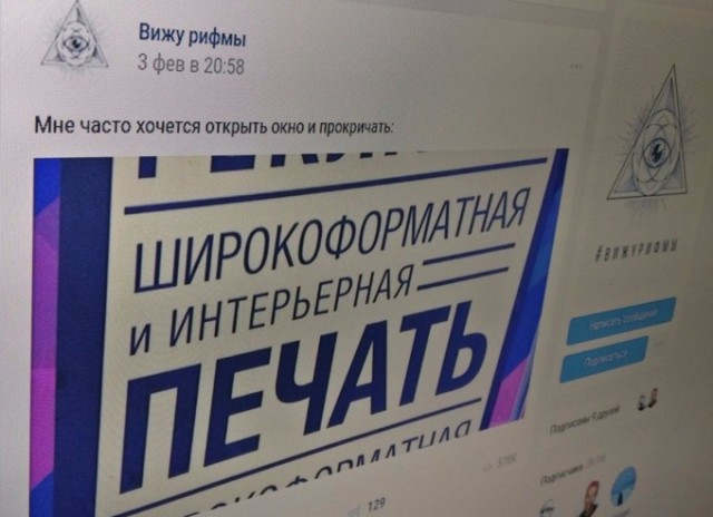 8 февраля 2018 года во «ВКонтакте» появилось сообщество «Вижу Рифмы»: там публикуют авторские стихи, но роль последней строчки выполняет фраза из рекламы, билбордов, этикеток и случайных надписей.